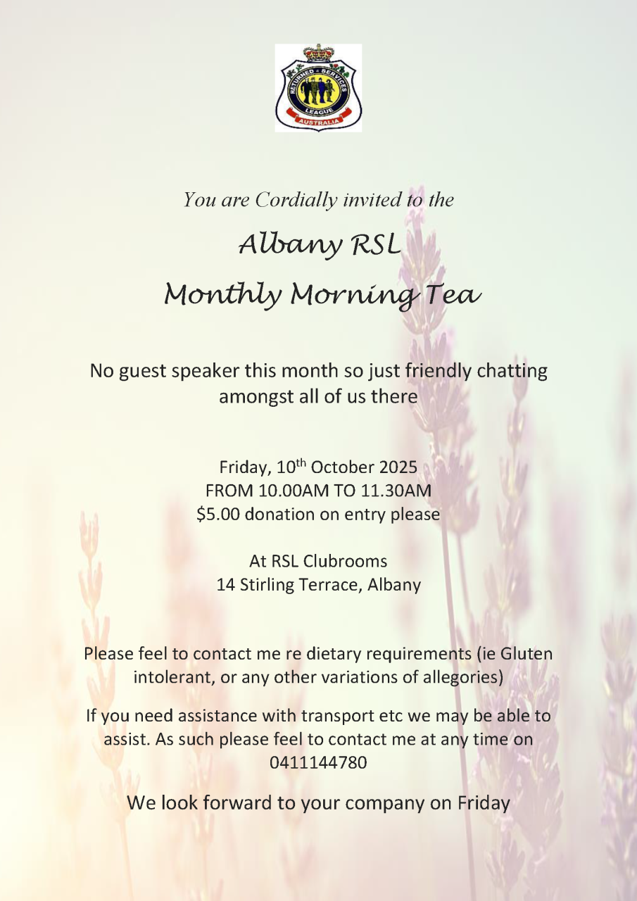 Join Albany RSL for their Monthly Morning Tea. Friday, 10 October 2025 From 10.00AM to 11.30AM $5.00 donation on entry At RSL Clubrooms - 14 Stirling Terrace, Albany
